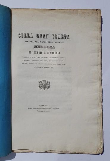 CALANDRELLI, Ignazio. Sulla gran cometa apparsa nel marzo dell’anno 1843. Rome, Giovanni Olivieri, 1844.