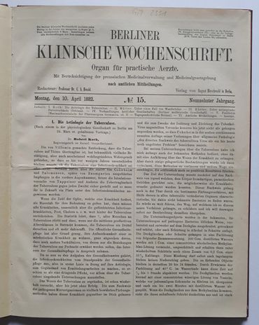 KOCH, Robert. Die Aetiologie der Tuberculose. (Nach einem in der physiologischen Gesellschaft zu Berlin am 24. März gehaltenen Vortrage). Berlin, August Hirschwald, 1882.