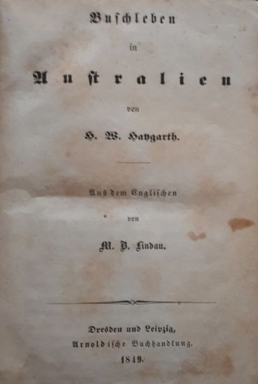 HAYGARTH, Henry William. Buschleben in Australien … Aus dem Englischen von M.B. Lindau. Dresden and Leipzig, Arnoldische Buchhandlung, 1849.